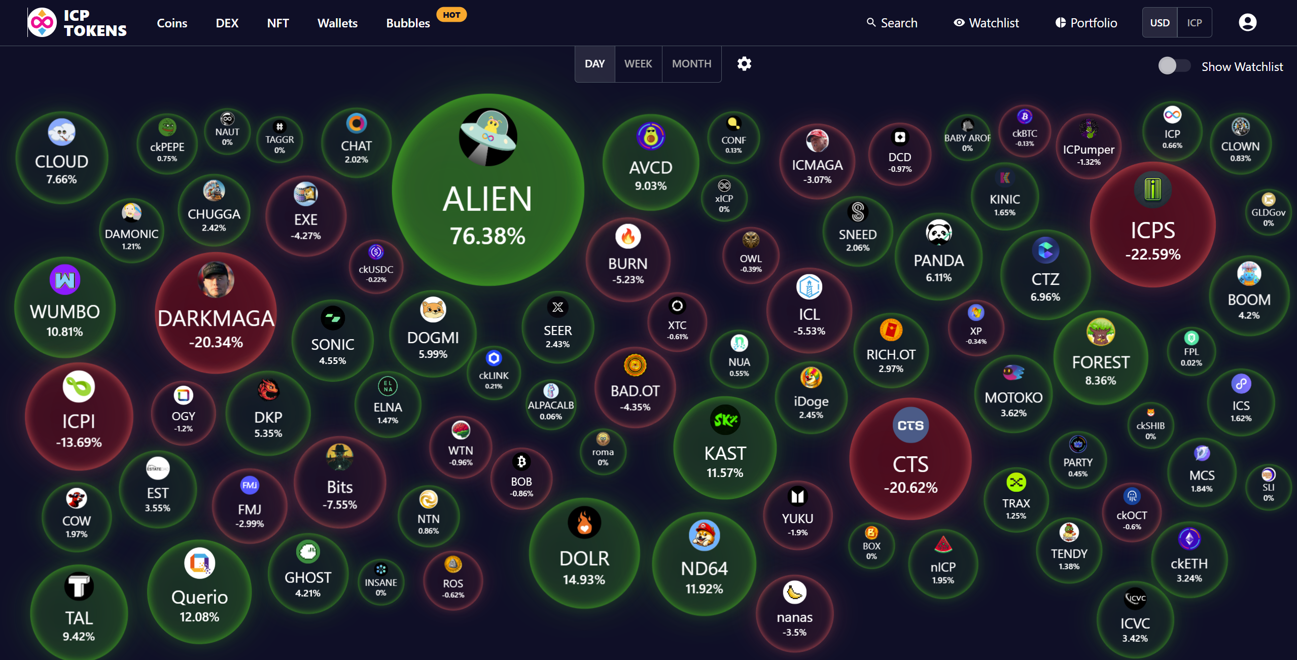 With a clear color-coded system, the **Bubbles Map** makes it simple to identify the top-performing and underperforming tokens within the ICP ecosystem. This helps users spot trends quickly and make informed decisions based on the overall market landscape.